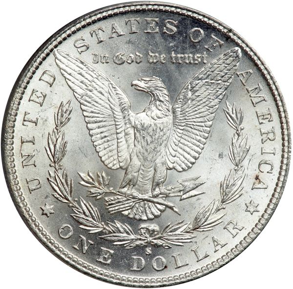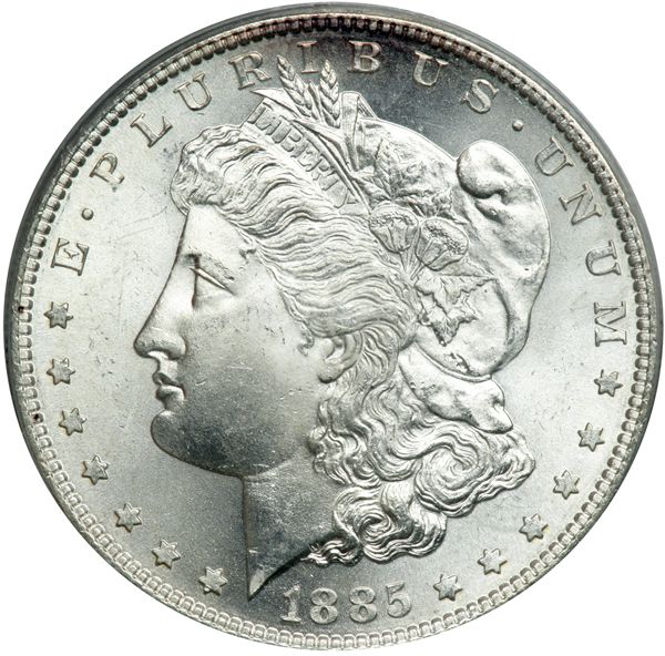 1885-S Morgan Dollar. PCGS graded MS-65. Housed in an Old Green Holder. A pure as satin silvery tint fascinates the eye from this lustrous piece, a coin whose mint glow goes round and round. Things being what they are, it is not easy to find such luster. So too crisp definition on the main devices counts for a lot. Mathematically exact standards are seen in the sharp hair and eagle details. San Francisco Mint quality at its level best! Pop 427; 36 finer, 5 in 65+, 29 in 66, 2 in 67 (PCGS # 7164) .