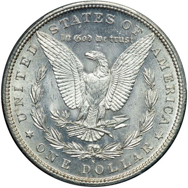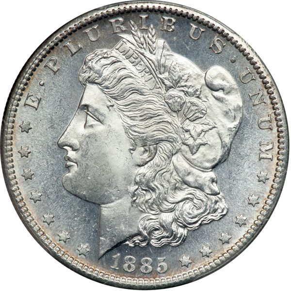 1885-S Morgan Dollar. PCGS graded MS-64. The obverse displays reflective surfaces. A white coin, bold and original (PCGS # 7164) .