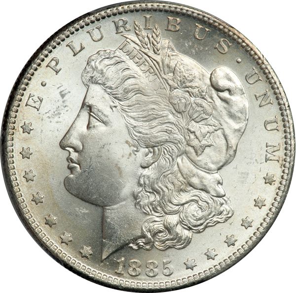 1885-S Morgan Dollar. PCGS graded MS-64. Well struck and totally white. A flashy gem (PCGS # 7164) .