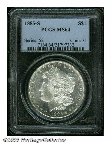 <B>1885-S<S$1> MS64 PCGS.</B></I> The obverse is semi-prooflike, while the reverse displays prominent cartwheel luster. Not fully struck in the centers, but this impressive near-Gem has clean fields and only wispy imperfections on the cheek.