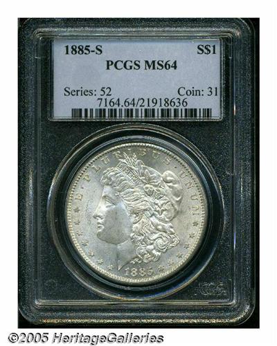 <B>1885-S<S$1> MS64 PCGS.</B></I> VAM-6. A Top 100 Variety. Gently toned in chestnut hues, this intricately struck and fully lustrous example would surely earn a full Gem grade were it not for a wispy graze on Liberty's chin.