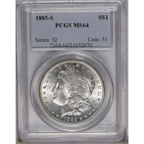 <B>1885-S<img border='0' src='http://www.heritagecoins.com/images/star.gif' width=10 height=10>$1> MS64 PCGS.</B></I> Virtually untoned with some contrast between the lustrous fields and slightly frosted devices; the reverse in particular exhibits prooflike tendencies. Well struck with scattered abrasions that limit the grade.