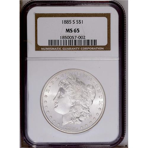 <B>1885-S<img border='0' src='http://www.heritagecoins.com/images/star.gif' width=10 height=10>$1> MS65 NGC.</B></I> VAM-2. The top of the 5 in the date is widely recut. This sharply struck Gem has potent luster and a fully brilliant appearance overall. Although more available than the higher mintage 1884-S, the 1885-S is nonetheless difficult to obtain any finer. Census: 172 in 65, 10 finer (3/06). <BR><BR><B>Important notice:</B> Heritage usually auctions material at the rate of 200-250 lots per hour. On some occasions eBay Live bid software or the Internet may not be able to keep up with the pace of the auction. We recommend placing a realistic absentee bid now as insurance to avoid disappointment. Occasionally the auctioneer may eliminate or reject an eBay Live bid, and the auctioneer may also reopen a lot after the close of the eBay live bidding (usually because we missed an audience bid), and may reject your bid even if it shows you as the winning bidder. By bidding via eBay Live, you agree that Heritage may award the lot to another bidder at its sole discretion under the circumstances described above or any other reasonable circumstances. Since eBay bids are not shown to us until we open the lot on the floor, we treat those bids just like floor bids. In most cases the floor responds before the eBay bid is presented to us, due to Internet lag time, so for consistency we have made it a policy that floor bids are always considered first over tie eBay live bids. Also please note that all Heritage lots purchased through eBay Live carry a 20% Buyer's Premium. Please make sure you read the Terms and Conditions before you bid. This lot is being auctioned in conjunction with a live floor auction by Heritage Galleries & Auctioneers. All final auction and invoice information will be supplied by Heritage Galleries & Auctioneers, and all other information should be considered preliminary. Lot:3451 <BR><BR><B>Winning Notification and Billing:</B> After the FINAL session in this auction is complete, Heritage will send e-mail and snail mail invoices. This process normally takes several days. All final auction and invoice information will be supplied by Heritage Galleries & Auctioneers, and all other information should be considered preliminary. <BR><BR>This auction will be conducted on a live auction floor and over the Internet through eBay Live. If you choose to place an absentee bid, please take a moment to <font color='#0000ff'><u><a href='http://pages.ebay.com/liveauctions/help/before/laabsentee.html'>learn how eBay Live absentee bidding works</a></u></font><font color='#000000'>
