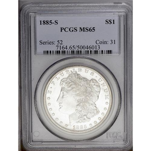 <B>1885-S<img border='0' src='http://www.heritagecoins.com/images/star.gif' width=10 height=10>$1 MS65 PCGS.</B></I> A very pleasing example with near prooflike fields and devices. The fields on this coin are relatively free of defect, save for some tiny pin marks and a few faint luster grazes. Both sides are brilliant and fully lustrous. This example is an eye-appealing Gem.<BR><I>From The Leslie E. Lunsford Collection, #7 Current Finest Registry Morgan Dollars Basic Set, Circulation Strikes.</B></I>