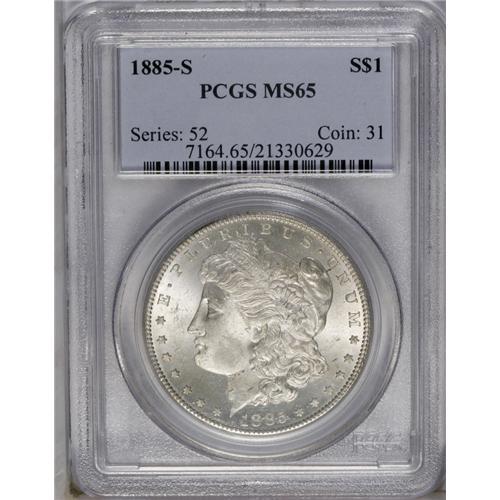 <B>1885-S<img border='0' src='http://www.heritagecoins.com/images/star.gif' width=10 height=10>$1> MS65 PCGS.</B></I> Attractive luster and a slightly flat strike are both common for the issue. A light, hazy gray patina covers both sides of this pleasing Gem with few marks.<BR><I>From The Chicago-Ark Collection.</B></I>