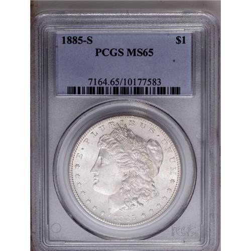 <B>1885-S<img border='0' src='http://www.heritagecoins.com/images/star.gif' width=10 height=10>$1> MS65 PCGS.</B></I> Definitely a cut above the usual Redfield example of this scarce and popular S-mint. The face of Liberty is remarkably free from abrasions--copious bagmarks being a hallmark of the Redfield coins. Both sides are bright and essentially untoned with rich mint frost. A premium coin for this difficult issue.