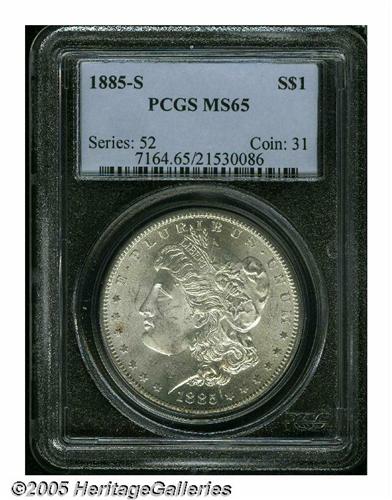 <B>1885-S<S$1> MS65 PCGS.</B></I> This '85-S portrays full luster and nearly untoned surfaces, save for a touch of color at star 5 and on the lower hair curls. The design elements are well struck, except for softness in the hair above Liberty's ear. Smooth, well preserved surfaces reveal just a few minor scuffs on Liberty's cheek. This issue becomes elusive in higher grades, in which PCGS has certified just 26 examples.