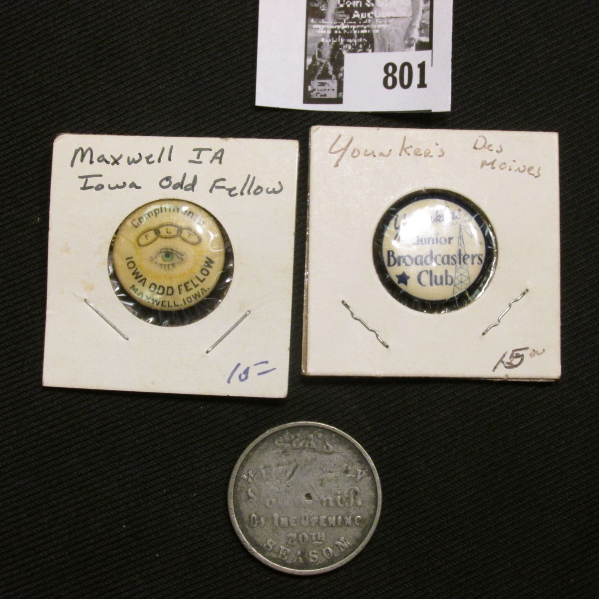 1885 "Sea's Millinery Dept.", reverse only partially legible, most likely pewter; celluloid "Compliments Iowa Odd Fellow Maxwellm Iowa"; & "Younkers Junior Broadcaster Club", pin-back.