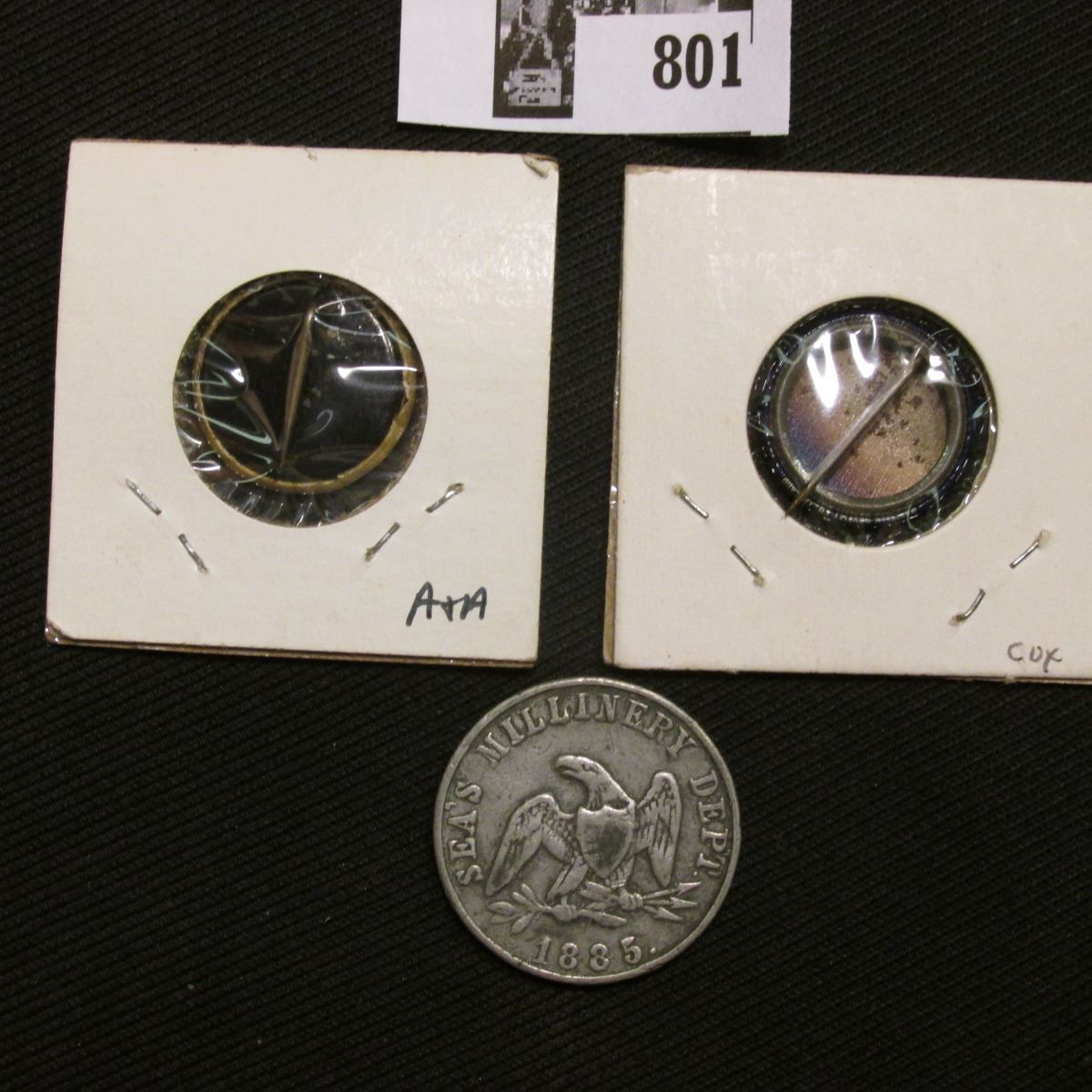 1885 "Sea's Millinery Dept.", reverse only partially legible, most likely pewter; celluloid "Complim