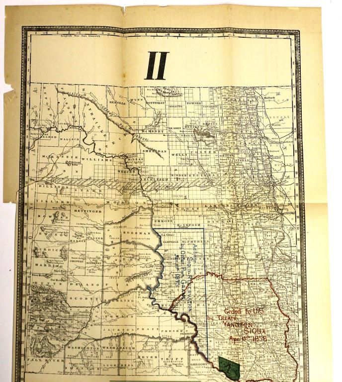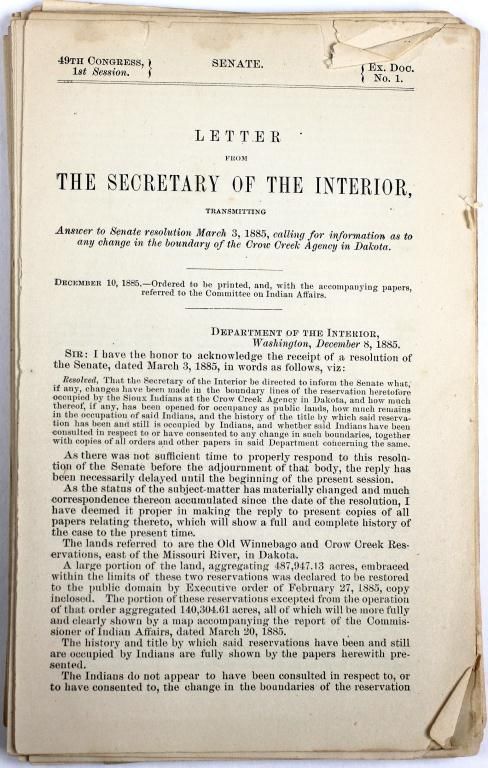1885 Secretary of Interior booklet, loose leafed discussing the boundaries of the Crow Creek Agency in the Dakota Territory, various Sioux Treaties and other areas of concern for the Plains Indians. A wealth of information and history, includes various maps showing boundries and reservation areas. Est. 250-400
