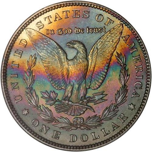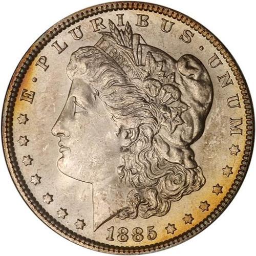 <b>1885 Toned Morgan Dollar. NGC graded MS64 Star Designation for Eye Appeal.</b> A lustrous example of this high mintage date, marvelously toned and only mildly abraded; excellent silver color on the obverse, but it is the reverse where the bands of color shine! <b>(PCGS # 7158)</b>