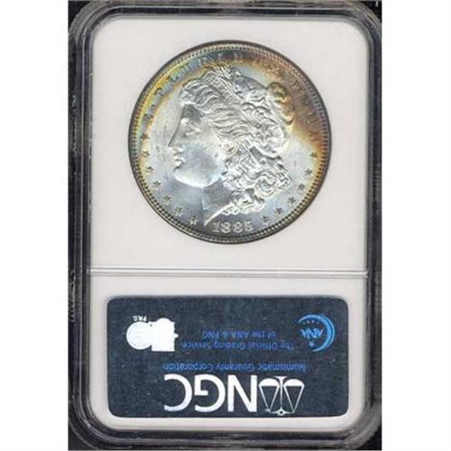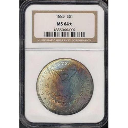 <b>1885 Toned Morgan Dollar. NGC graded MS64 Star Designation for Eye Appeal.</b> Satin fields rippling with cartwheel luster. The more matte designs stand out nicely against this finish. Splendid reverse toning, just silver-white color for the obverse, and the valuable Star designation from NGC <b>(PCGS # 7158)</b>