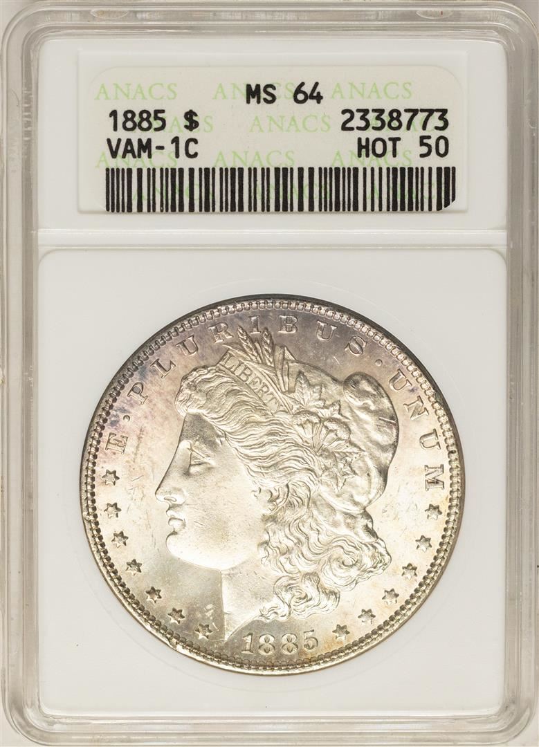 One 1885 VAM-1C $1 Morgan Silver Dollar Coin ANACS MS64 Hot 50. ANACS Certified.
