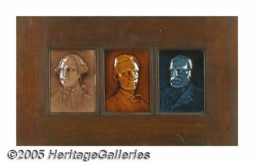 <B>1885-dated Ceramic Tiles of George Washington, Abraham Lincoln, and Ulysses S. Grant by the J. G. and J. F. Low Art Tile Works, in Original Hardwood Frame</B></I> Each tile imprinted on reverse with company name and "Chelsea, Mass., U.S.A., copyright by J. G. and J. F. Low 1885." Clearly produced on the occasion of Grant's death that year. We have had a number of political and presidential ceramic tiles over the years, but do not recall having these. Great shape, including original frame. Each tile is 4.375" x 6", overall unit 19.5" x 11.5". Lot:258