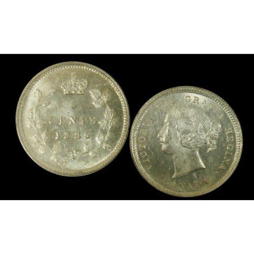 1885 small 5 5¢ ICCS MS64PQ. Wow! Wow! An amazing Victoria five cent silver example. Excellent strike with clean fields and great surfaces. Fully brilliant and lustrous. The nicest example ever handled by TCNC. Possibly the finest known! Extremely rare!