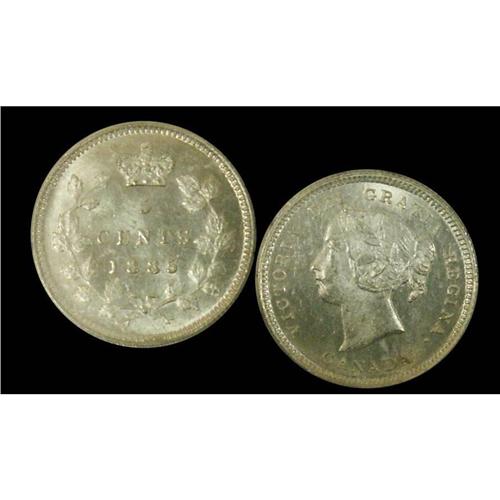 1885 small 5 5¢ ICCS MS64PQ. Wow! Wow! An amazing Victoria five cent silver example. Excellent strike with clean fields and great surfaces. Fully brilliant and lustrous. The nicest example ever handled by TCNC. Possibly the finest known! Extremely rare!