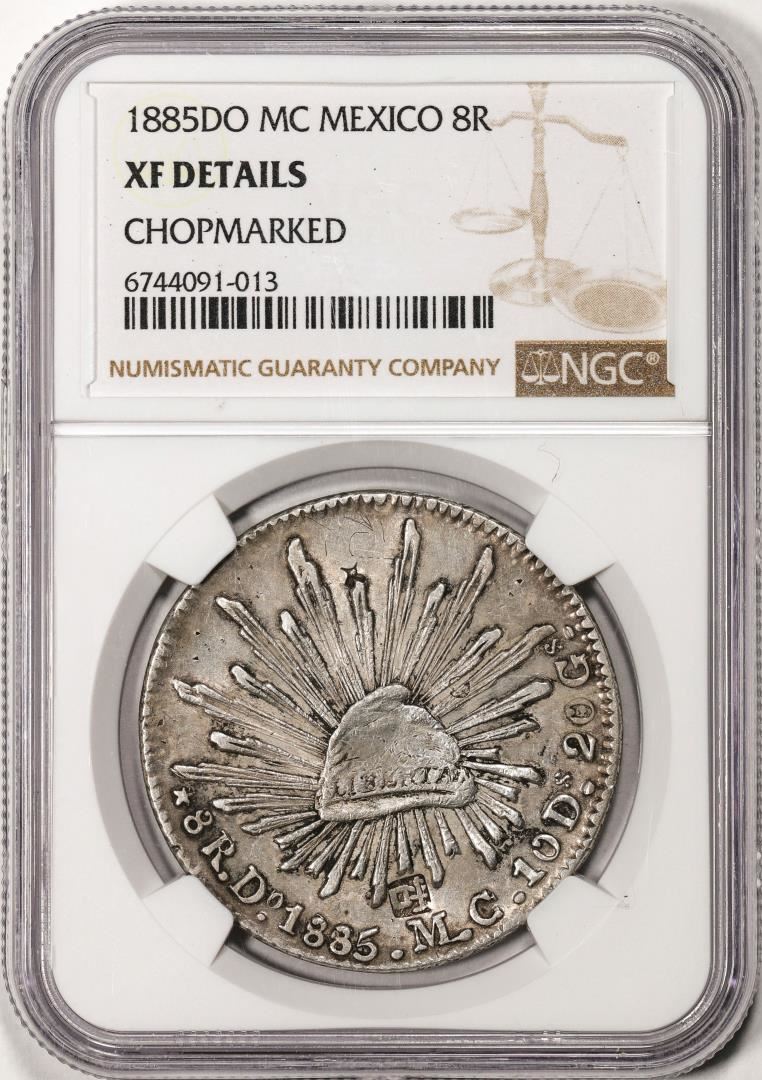 One 1885DO MC Mexico 8 Reales Silver Coin NGC XF Details Chopmarked. NGC Certified.