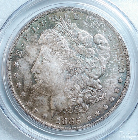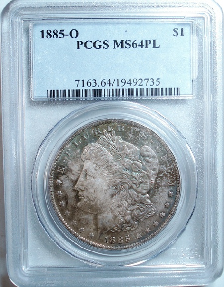 1885O Morgan $ PCGS64PL TOP OF ROLL COIN toned obverse
