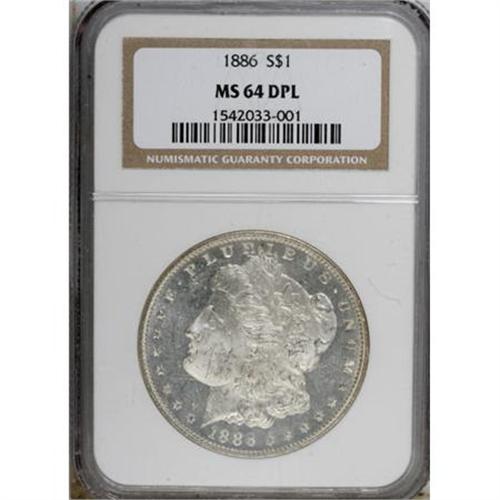 <B>1886 $1 MS64 Deep Mirror Prooflike NGC.</B></I> NGC Census: (208/69). PCGS Population (218/137). Numismedia Wsl. Price for NGC/PCGS coin in MS64: $300. (#97167)<BR><BR><b>Shipping:</b> Coins & Currency (<a target="_blank" href="http://www.heritageauctions.com/common/shipping.php">view shipping information</a>)
