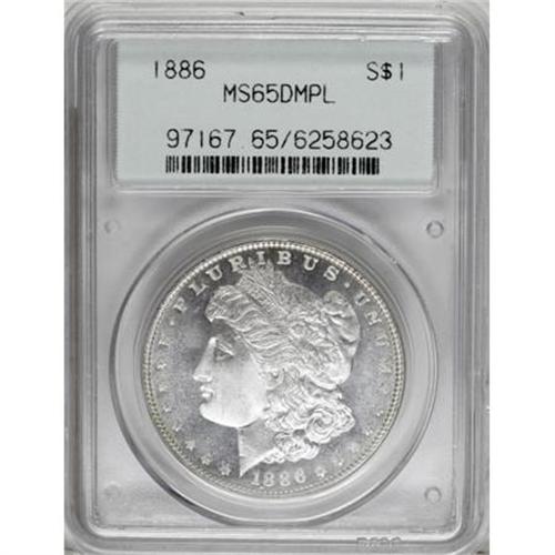 <B>1886 $1 MS65 Deep Mirror Prooflike PCGS.</B></I> PCGS Population (116/22). NGC Census: (60/11). Numismedia Wsl. Price for NGC/PCGS coin in MS65: $800. (#97167)<BR><BR><b>Shipping:</b> Coins & Currency (<a target="_blank" href="http://www.heritageauctions.com/common/shipping.php">view shipping information</a>)