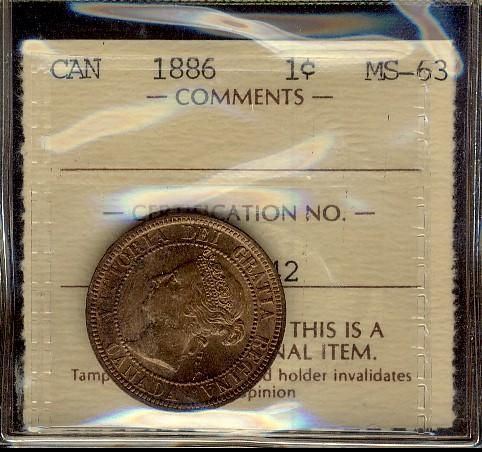 1886 1¢ ICCS MS63. Not designated , however coin is Red.