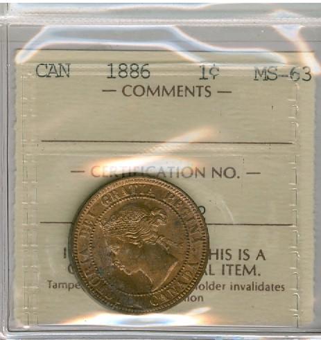 1886 1¢ ICCS MS63RD. Lustrous 85% red example.