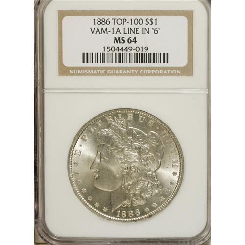 <B>1886 $1 MS64 NGC.</B></I> Vam-1A, Line in "6" Top-100. NGC Census: (74050/40084). PCGS Population (28705/14170). Mintage: 19,963,886. Numismedia Wsl. Price for NGC/PCGS coin in MS64: $44. (#7166)<BR><BR><b>Shipping:</b> Coins & Currency (<a target="_blank" href="http://www.heritageauctions.com/common/shipping.php">view shipping information</a>)