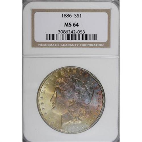 <B>1886 $1 MS64 NGC.</B></I> NGC Census: (37536/20242). PCGS Population (29167/14337). Mintage: 19,963,886. Numismedia Wsl. Price for NGC/PCGS coin in MS64: $45. (#7166)<BR><BR><B>Coin Engraver:</B> George T. Morgan<BR><BR><b>Shipping:</b> Coins & Currency (<a target="_blank" href="http://www.heritageauctions.com/common/shipping.php">view shipping information</a>)
