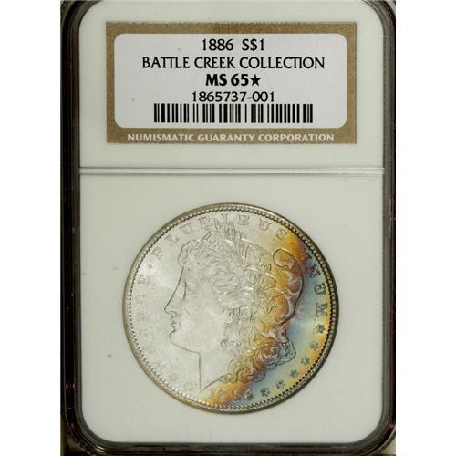 <B>1886 $1 MS65<img border='0' src='http://www.heritagecoins.com/images/star.gif' width=10 height=10> NGC.</B></I> Ex: Battle Creek Collection. NGC Census: (32026/8058). PCGS Population (11993/2177). Mintage: 19,963,886. Numismedia Wsl. Price for NGC/PCGS coin in MS65: $123. (#7166)<BR><BR><b>Shipping:</b> Coins & Currency (<a target="_blank" href="http://www.heritageauctions.com/common/shipping.php">view shipping information</a>)