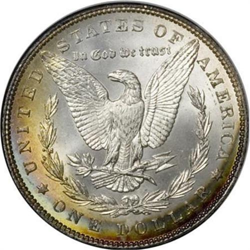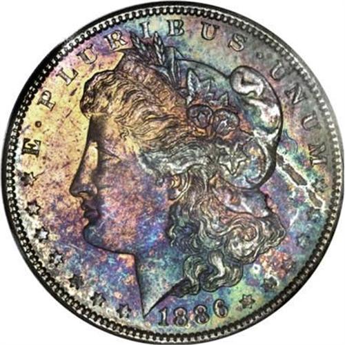 <B>1886 $1 MS65 </B></I><img src="/images/star.gif" width="10" height="10" alt="" border="0"><B> NGC.</B></I> Ex: Battle Creek Collection. The shining reverse of this well-defined Gem shows subtle bands of gold-orange and aquamarine at the lower and left reverse. The obverse has crazy-quilt blue-green, lemon-gold, violet, and magenta-rose patina.<BR><BR><B>Coin Engraver:</B> George T. Morgan<BR><BR><b>Shipping:</b> Coins & Currency (<a target="_blank" href="http://www.heritageauctions.com/common/shipping.php">view shipping information</a>)
