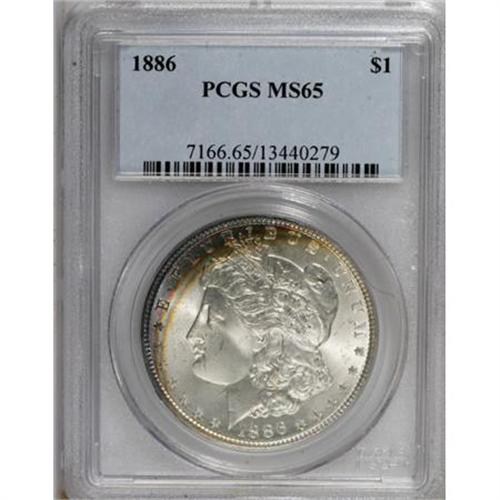<B>1886 $1 MS65 PCGS.</B></I> PCGS Population (12076/2209). NGC Census: (16154/4088). Mintage: 19,963,886. Numismedia Wsl. Price for NGC/PCGS coin in MS65: $117. (#7166)<BR><BR><B>Coin Engraver:</B> George T. Morgan<BR><BR><b>Shipping:</b> Coins & Currency (<a target="_blank" href="http://www.heritageauctions.com/common/shipping.php">view shipping information</a>)