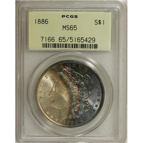 <B>1886 $1 MS65 PCGS.</B></I> PCGS Population (11993/2177). NGC Census: (15977/4018). Mintage: 19,963,886. Numismedia Wsl. Price for NGC/PCGS coin in MS65: $123. (#7166)<BR><BR><B>Coin Engraver:</B> George T. Morgan<BR><BR><b>Shipping:</b> Coins & Currency (<a target="_blank" href="http://www.heritageauctions.com/common/shipping.php">view shipping information</a>)