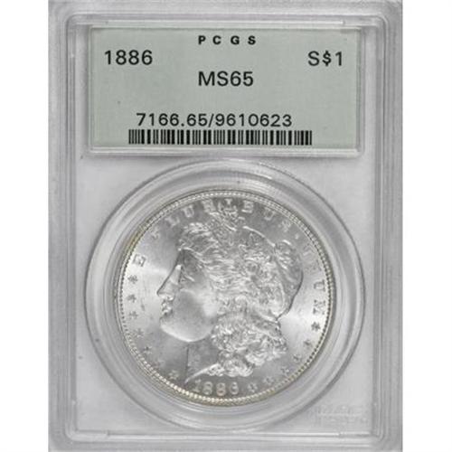 <B>1886 $1 MS65 PCGS.</B></I> PCGS Population (12056/2206). NGC Census: (16154/4088). Mintage: 19,963,886. Numismedia Wsl. Price for NGC/PCGS coin in MS65: $117. (#7166)<BR><BR><B>Coin Engraver:</B> George T. Morgan<BR><BR><b>Shipping:</b> Coins & Currency (<a target="_blank" href="http://www.heritageauctions.com/common/shipping.php">view shipping information</a>)