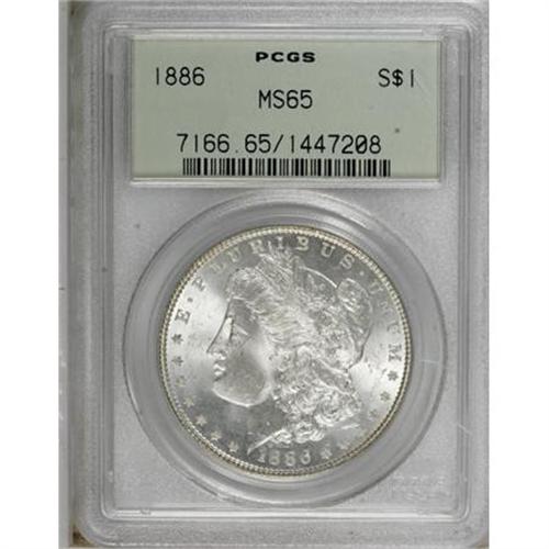 <B>1886 $1 MS65 PCGS.</B></I> PCGS Population (12117/2228). NGC Census: (16317/4126). Mintage: 19,963,886. Numismedia Wsl. Price for NGC/PCGS coin in MS65: $117. (#7166)<BR><BR><B>Coin Engraver:</B> George T. Morgan<BR><BR><b>Shipping:</b> Coins & Currency (<a target="_blank" href="http://www.heritageauctions.com/common/shipping.php">view shipping information</a>)