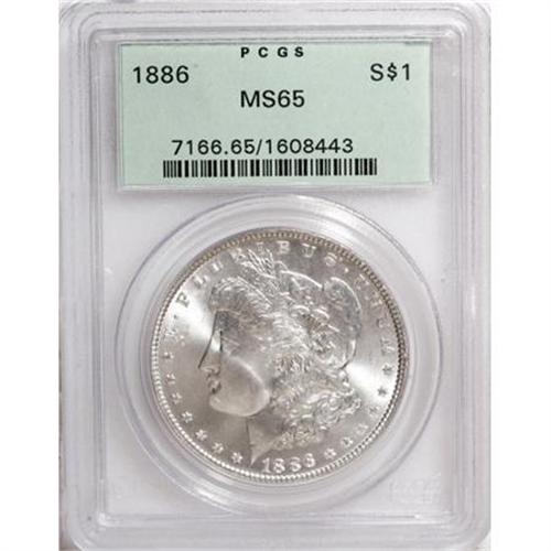<B>1886 $1 MS65 PCGS.</B></I> PCGS Population (12128/2236). NGC Census: (16317/4127). Mintage: 19,963,886. Numismedia Wsl. Price for NGC/PCGS coin in MS65: $117. (#7166)<BR><BR><B>Coin Engraver:</B> George T. Morgan<BR><BR><b>Shipping:</b> Coins & Currency (<a target="_blank" href="http://www.heritageauctions.com/common/shipping.php">view shipping information</a>)
