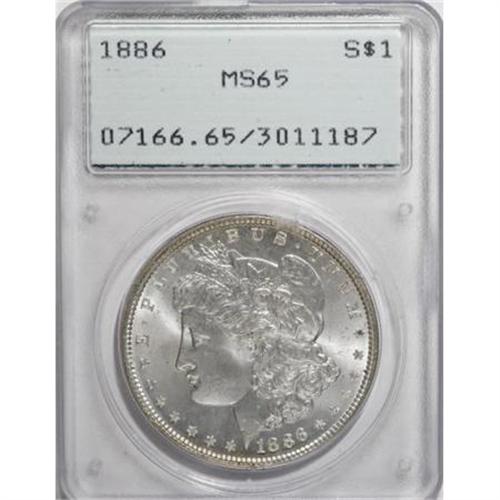 <B>1886 $1 MS65 PCGS.</B></I> PCGS Population (12167/2256). NGC Census: (16467/4176). Mintage: 19,963,886. Numismedia Wsl. Price for NGC/PCGS coin in MS65: $125. (#7166)<BR><BR><B>Coin Engraver:</B> George T. Morgan<BR><BR><b>Shipping:</b> Coins & Currency (<a target="_blank" href="http://www.heritageauctions.com/common/shipping.php">view shipping information</a>)