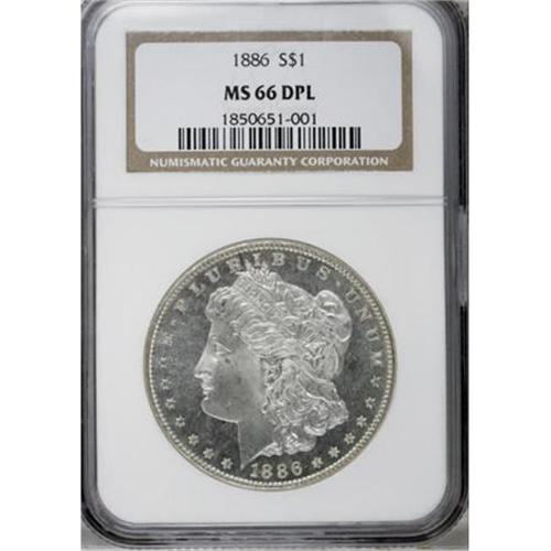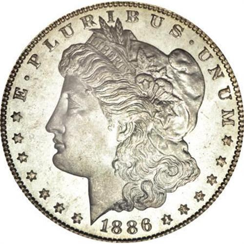 <B>1886 $1 MS66 Deep Mirror Prooflike NGC.</B></I> Deeply mirrored fields offer strong contrast with lightly frosted and well struck design features on this Premium Gem. The well-preserved surfaces display hints of light gold patina at the margins. A challenging issue in the better Deep Mirror Prooflike grades, with just one such coin graded by NGC (11/07).<BR><BR><b>Shipping:</b> Coins & Currency (<a target="_blank" href="http://www.heritageauctions.com/common/shipping.php">view shipping information</a>)