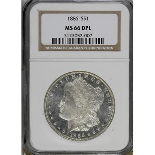 <B>1886 $1 MS66 Deep Mirror Prooflike NGC.</B></I> Sharply struck with surprisingly powerful mirrors for this Philadelphia issue. Small dots of silver-gray haze float over the gleaming fields. NGC has graded only one numerically finer Deep Mirror Prooflike coin (2/08).<BR><BR><b>Shipping:</b> Coins & Currency (<a target="_blank" href="http://www.heritageauctions.com/common/shipping.php">view shipping information</a>)
