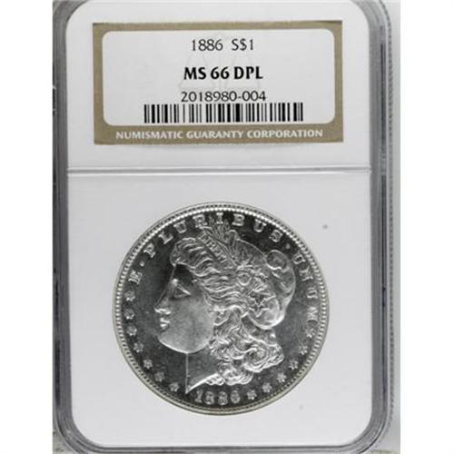 <B>1886 $1 MS66 Deep Mirror Prooflike NGC.</B></I> Well produced, with pinpoint striking sharpness noted on all of the design elements, and immensely deep reflectivity observed in the fields. The surfaces are very clean, and distracting marks are nonexistent. Morgan dollars from this issue are extremely common in most Mint State grades through MS66, but Deep Mirror Prooflikes are rare. Census: 10 in 66 Deep Mirror Prooflike, 1 finer (6/07). <BR><I>From the Diamond Head Collection.</B></I><BR><BR><b>Shipping:</b> Coins & Currency (<a target="_blank" href="http://www.heritageauctions.com/common/shipping.php">view shipping information</a>)