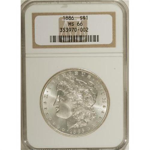 <B>1886 $1 MS66 NGC.</B></I> NGC Census: (3465/571). PCGS Population (1978/197). Mintage: 19,963,886. Numismedia Wsl. Price for NGC/PCGS coin in MS66: $340. (#7166)<BR><BR><b>Shipping:</b> Coins & Currency (<a target="_blank" href="http://www.heritageauctions.com/common/shipping.php">view shipping information</a>)
