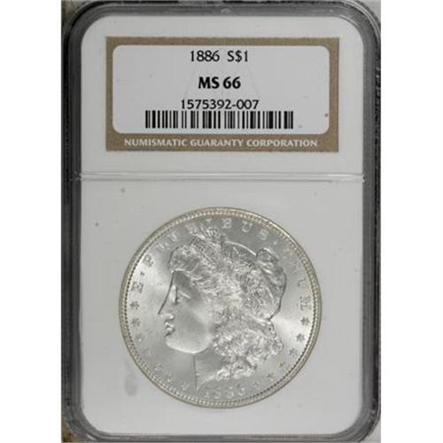 <B>1886 $1 MS66 NGC.</B></I> NGC Census: (3480/572). PCGS Population (1978/197). Mintage: 19,963,886. Numismedia Wsl. Price for NGC/PCGS coin in MS66: $300. (#7166)<BR><BR><b>Shipping:</b> Coins & Currency (<a target="_blank" href="http://www.heritageauctions.com/common/shipping.php">view shipping information</a>)
