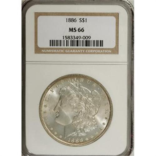<B>1886 $1 MS66 NGC.</B></I> NGC Census: (3507/576). PCGS Population (1996/201). Mintage: 19,963,886. Numismedia Wsl. Price for NGC/PCGS coin in MS66: $300. (#7166)<BR><BR><B>Coin Engraver:</B> George T. Morgan<BR><BR><b>Shipping:</b> Coins & Currency (<a target="_blank" href="http://www.heritageauctions.com/common/shipping.php">view shipping information</a>)
