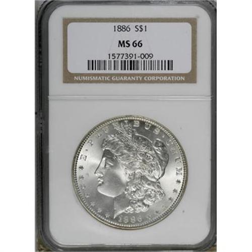 <B>1886 $1 MS66 NGC.</B></I> . NGC Census: (3572/587). PCGS Population (2045/203). Mintage: 19,963,886. Numismedia Wsl. Price for NGC/PCGS coin in MS66: $300. (#7166)<BR><BR><B>Coin Engraver:</B> George T. Morgan<BR><BR><b>Shipping:</b> Coins & Currency (<a target="_blank" href="http://www.heritageauctions.com/common/shipping.php">view shipping information</a>)