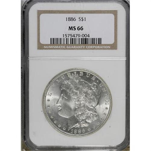 <B>1886 $1 MS66 NGC.</B></I> NGC Census: (3585/591). PCGS Population (2052/204). Mintage: 19,963,886. Numismedia Wsl. Price for NGC/PCGS coin in MS66: $300. (#7166)<BR><BR><B>Coin Engraver:</B> George T. Morgan<BR><BR><b>Shipping:</b> Coins & Currency (<a target="_blank" href="http://www.heritageauctions.com/common/shipping.php">view shipping information</a>)