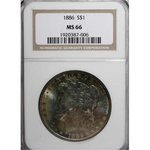 <B>1886 $1 MS66 NGC.</B></I> NGC Census: (3585/589). PCGS Population (2052/204). Mintage: 19,963,886. Numismedia Wsl. Price for NGC/PCGS coin in MS66: $300. (#7166)<BR><BR><B>Coin Engraver:</B> George T. Morgan<BR><BR><b>Shipping:</b> Coins & Currency (<a target="_blank" href="http://www.heritageauctions.com/common/shipping.php">view shipping information</a>)
