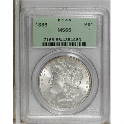 <B>1886 $1 MS66 PCGS.</B></I> PCGS Population (1978/197). NGC Census: (3465/571). Mintage: 19,963,886. Numismedia Wsl. Price for NGC/PCGS coin in MS66: $340. (#7166)<BR><BR><b>Shipping:</b> Coins & Currency (<a target="_blank" href="http://www.heritageauctions.com/common/shipping.php">view shipping information</a>)