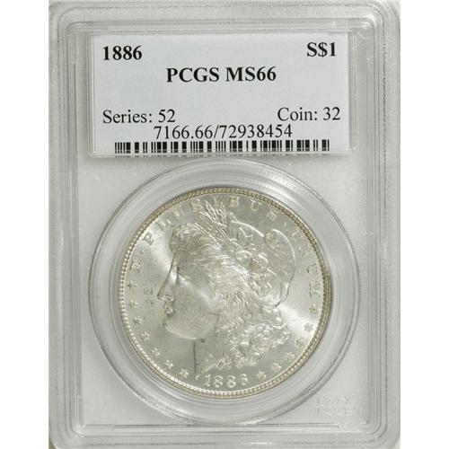 <B>1886 $1 MS66 PCGS.</B></I> PCGS Population (1984/196). NGC Census: (3406/558). Mintage: 19,963,886. Numismedia Wsl. Price: $340. (#7166)<BR><BR><b>Shipping:</b> Coins & Currency (<a target="_blank" href="http://www.heritageauctions.com/common/shipping.php">view shipping information</a>)