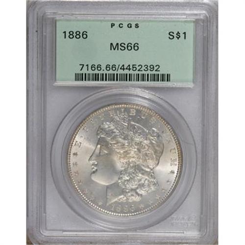 <B>1886 $1 MS66 PCGS.</B></I> PCGS Population (1978/197). NGC Census: (3490/574). Mintage: 19,963,886. Numismedia Wsl. Price for NGC/PCGS coin in MS66: $300. (#7166)<BR><BR><B>Coin Engraver:</B> George T. Morgan<BR><BR><b>Shipping:</b> Coins & Currency (<a target="_blank" href="http://www.heritageauctions.com/common/shipping.php">view shipping information</a>\)