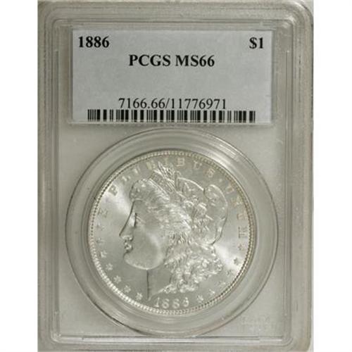 <B>1886 $1 MS66 PCGS.</B></I> PCGS Population (2005/201). NGC Census: (3512/576). Mintage: 19,963,886. Numismedia Wsl. Price for NGC/PCGS coin in MS66: $300. (#7166)<BR><BR><B>Coin Engraver:</B> George T. Morgan<BR><BR><b>Shipping:</b> Coins & Currency (<a target="_blank" href="http://www.heritageauctions.com/common/shipping.php">view shipping information</a>)