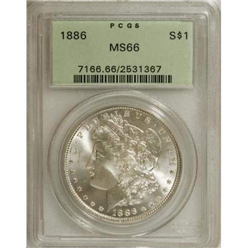 <B>1886 $1 MS66 PCGS.</B></I> PCGS Population (2001/201). NGC Census: (3507/576). Mintage: 19,963,886. Numismedia Wsl. Price for NGC/PCGS coin in MS66: $300. (#7166)<BR><BR><B>Coin Engraver:</B> George T. Morgan<BR><BR><b>Shipping:</b> Coins & Currency (<a target="_blank" href="http://www.heritageauctions.com/common/shipping.php">view shipping information</a>)